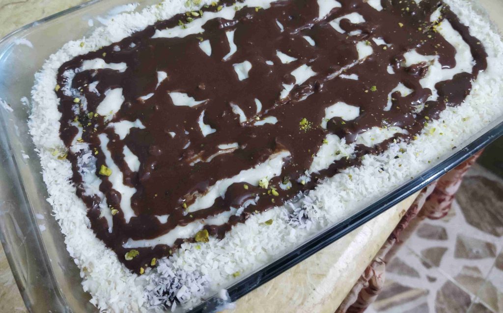 لحتا يثقل الخليط بنضيف ملعقة صغيرة فانيلا وبنحكرهن وبنزل الخليط ساخن على حبات البسكويت لحتا نغطي حبات البسكويت وبنتركو يبرد ملاحظة اذا بتحبو الكريمة بنكهة الشوكلاته ممكن تضيفو ملعقة كاكاو بودرة ملاحضة ثانية الخليط بضل قوامو كريمي حتا لو دخلناها الثلاجة قوام الطحين بالكريمة بختلف عن قوام النشا قوامها بكون متماسك أكثر وبس تبرد الكريمة بنزينها برشة جوز الهند والفستق الحلبي وممكن نزينها بالفواكه حسب الرغبة وزادت ملعقتين من الكريمة ضفت عليها ملعقة صغيرة كاكاو ذوبتها بملعقة صغيرة ماء مغلي وضفتها عالكريمة وزينت بيها الوجه بس انا لانو الكريمة كانت سخنة شوي ذابت معي بسبب ولادي مارح يتركوها تبرد وقوامها يتماسك اكثروان شالله تعجبكم وصحة وهنا يارب