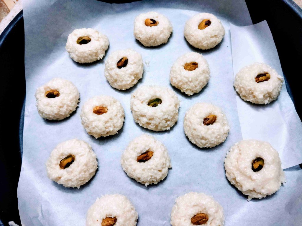 يسعد اوقاتكم بكل خير اليوم رح نعمل اسرع حلا ممكن تعملي بدقائق معدودة اول مرحلة بنضيف ثلاث اكواب جوز الهند الافضل يكون ناعم وبنزل عليه حليب مكثف على دفعات وبنخلط واول ما نشوف تجمعت وصار متماسكة سهل تكوريها بنشكلها كرات وبنصفهن بصينية مفروش ورق زبدة وبندهن وجه الكرات بالسمنة وبندخلهن الفرن وبس يتحمرو بنطالعن وبنتركهن يبردو انا اول مرة عملت الكرات كثر عندي الحليب المكثف ساحو شوي بالفرن بس نفس الطعم