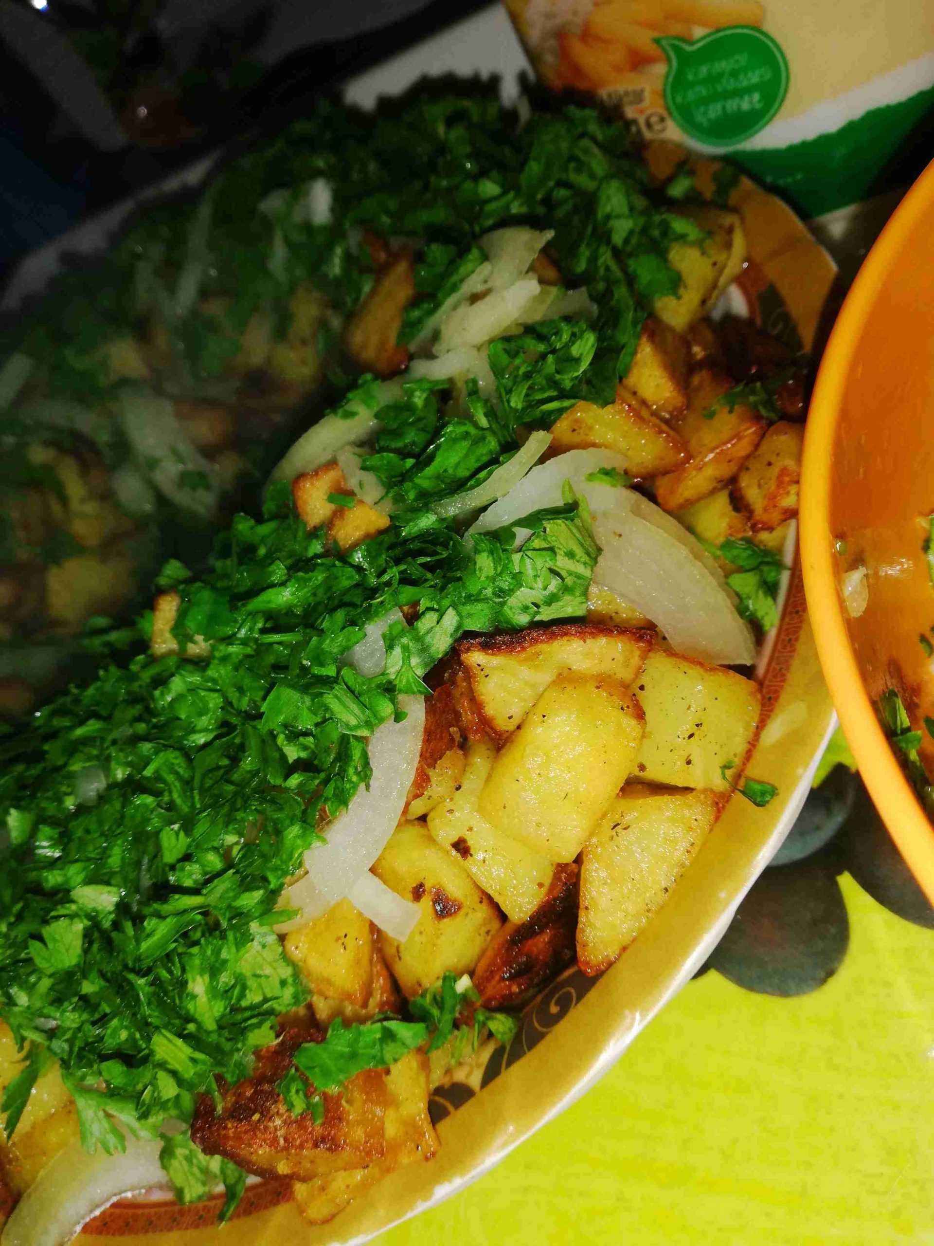 نفرم البقدونس ويضاف البقدونس الأخضر المفروم فوق البصل، نضع الفلفل الأحمر المطحون ونضيف كل أنواع البهارات من كمون وكزبرة يابسة وفلفل أسود وملح. ونضيف البطاطا والبقدونس والبصل.في صحن التقديم ثم نضع قطعة الفحم في صحن صغير فيه القليل من السمنة أو زيت نباتي ونغطيها بورق ألمنيوم أو قشر البصل ونغطيها بسرعة لحتى تدخن البطاطا
