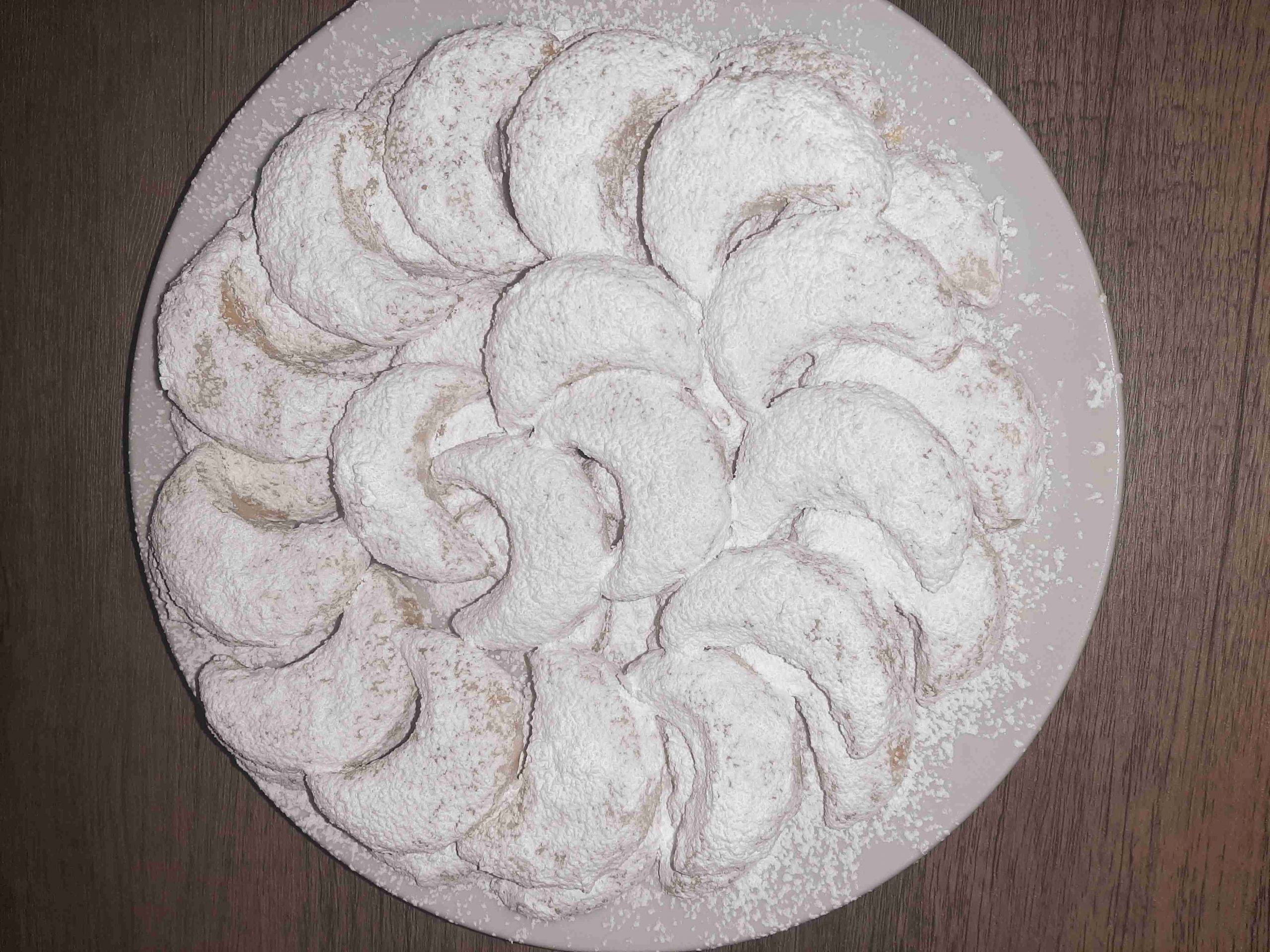 نفردها بسمك متوسط ونشكلها باي اداه دائريه الحجم، نضغط دأئرة ونرجع نضغط نصف دائرة حتي تعطينا شكل الهلال الشكل التقليدي الصور توضخ طريقه التشكيل