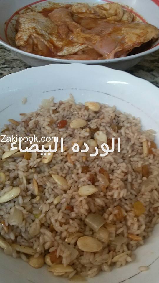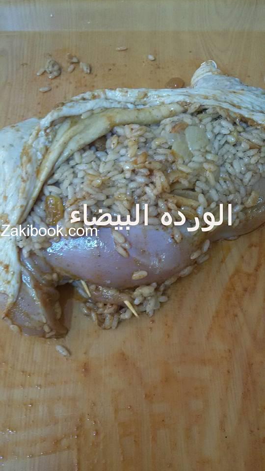 ونحضر الأرز نصب زيت في الطنجرة ونفرم بصلة متوسطة ونحمسها حتي تعطي لون بني فاتح ونضيف الأرز انا استخدمت كوب أرز وضفت عليه كوب الا شوية ماء ساخن وضفت الملح وبهارات الأرز وغطيت الطنجرة حتي جف الأرز وحمست الصنوبر في شوية زبدة ووضعت لوز وحمسته في الزبدة وزبيب حمسته وخلطتهم مع الأرز وحشيت الفخدة وصكرتها بعود الاسنان