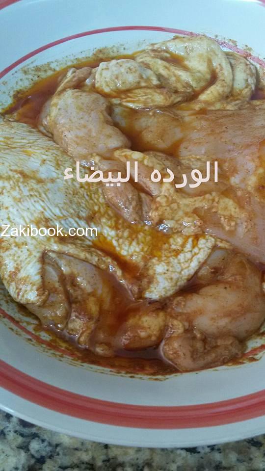 وبعدين تبلي الافخاذ بتابل دجاج وليمون وخل وفلفل أحمر وملح وزعتر بودر واكليل بودر وثوم وبصل بودر وشوية لبن أو زبادي بدون نكهة وزيت زيتون وشوية معجون طماطم ونترك الافخاد في التتبيلة ساعتين اواكثر