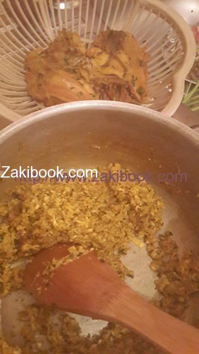 بعدها نزيل الدجاج عندما نتأكد من نضجه ،ونصفيه من المرق ، ونزيل عنه العظام ، ثم نقطعه قطع صغيرة، ويترك جانبا .