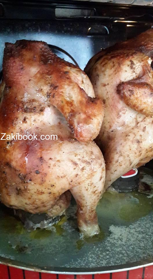 يوضع مع الماء منكهات قرفه ورق غار حب هال قشر ليمون وتوضع الصينيه بالفرن على درجة حراره 160 لمدة ساعتين حتى تحمر الدجاجة وتنضج