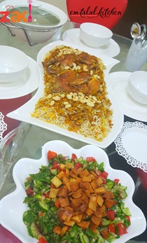 - في صينية التقديم نضع الرز ثم خلطة البصل والزبيب ثم الدجاج.