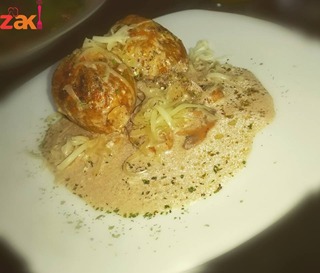 - يتم حشو حبات البطاطا باللحمة المفرومة وهنا يمكن اضافة الصنوبر اختياري مع الخلطة بعد الانتهاء يتم تسخين زيت قلي كثيف بمقلاة تيفال او اي نوع اخر غير لاصق وتوضع حبات البطاطا لحين الحصول على اللون الذهبي من ثم توضع على رول الفاين من أجل امتصاص الزيت من ثم نحضر صينية ونفرشها بالفطر ونضع فوقها حبات البطاطس المقلية ويضاف هنا ايضا كمون وفلفل اسود وبهار مشكل ومن ثم تصب مرقة الدجاج المصفاة وكريمة الطبخ فوقها يتم التأكد إذا كانت تحتاج ملح طعام اولا.