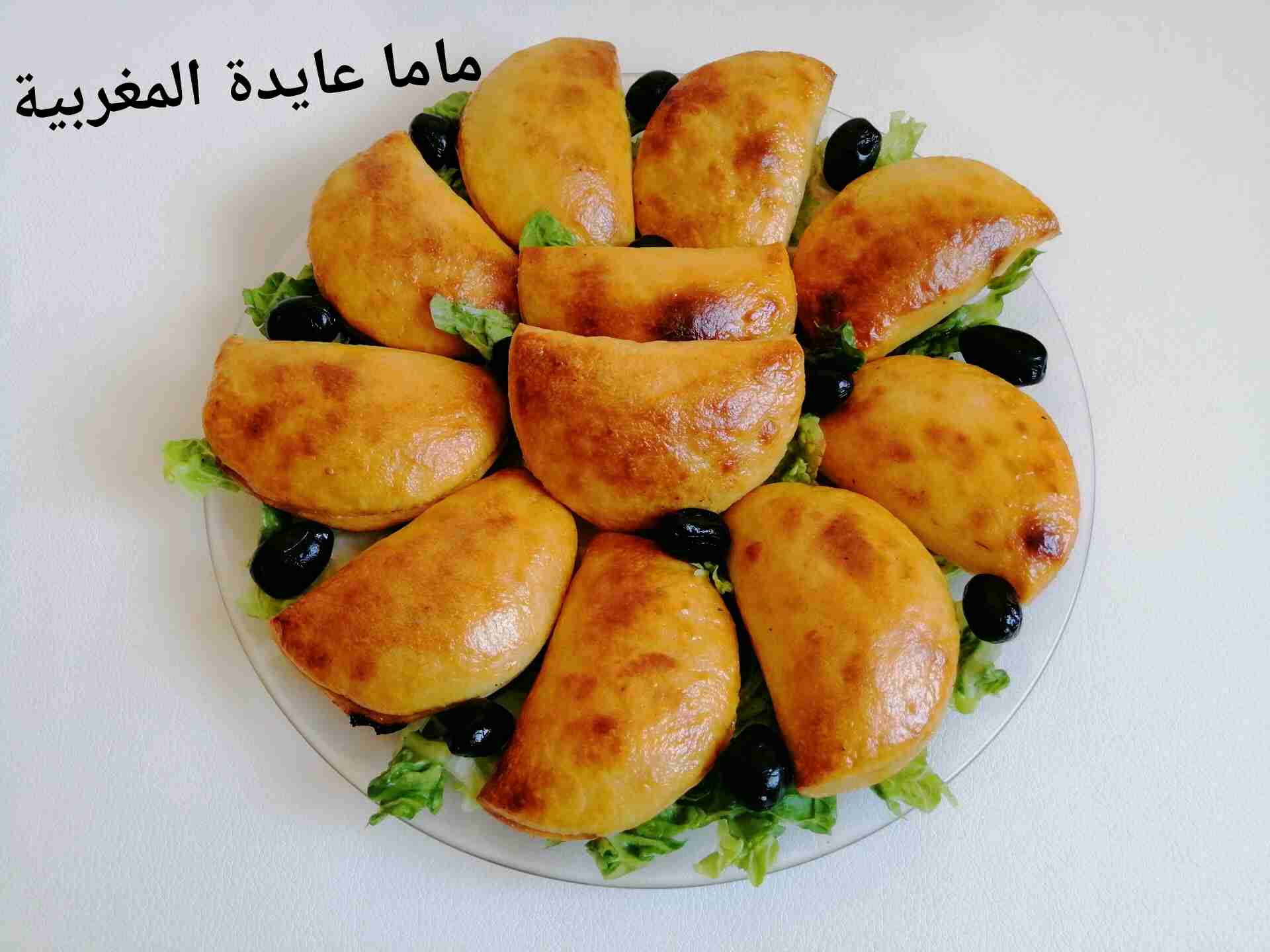 نقسم العجينة إلى كرات صغيرة و نبسط كل كرة بين بلاستيك و نحط ملعقة كبيرة مملوءة من الحشوة و نغطي عليها و نقطع على شكل نصف دائرة إلى أن ننهي الكرات.