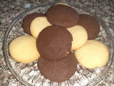 - نقوم بإضافة البيض والفانيليا وضربهم جيدا مع السكر والزبدة ثم نضيف الدقيق والبيكنج بودر تدريجيا حتى تتكون عجينة ثم نقوم بتقسيمها قسمين قسم ابيض والقسم الثاني نضيف عليه ملعقه الكاكاو ونعجنها جيدا ونشكلها على حسب الرغبه ونضع الصواني في فرن 180 درجة حتى ينضج.