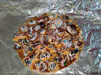 - في وعاء : نعجن التمر مع باقي المواد، ثم نأخذ منه قطع صغيرة ونرقها باليد ونلصقها فوق العجين بشكل متساوي بسمك نصف سم تقريبا.