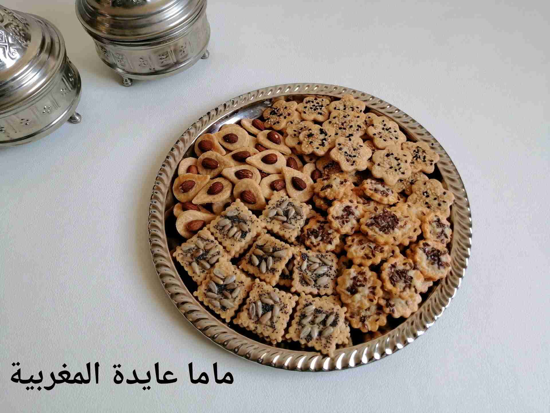 نسرح العجينة المنسمة بالفلفل الأحمر و بودرة لوز و نقطعها على شكل لوزة و نذهن ببياض بيض و نزين بحبة لوز مع الضغظ عليها.