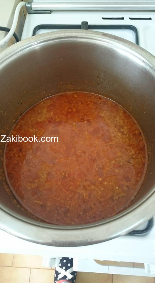 تحمس ثواني ثم نضيف صلصة طماطم وتحرك قليلا ثم طماطم مطحونه ..ونضيف قليل ماء حوالي كوب وتترك تتسبك على نار هادئة عشر دقائق..