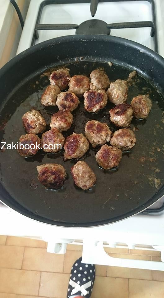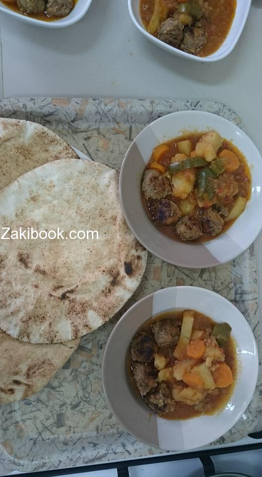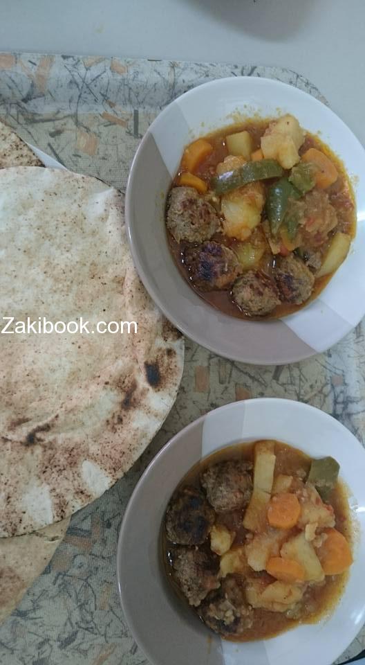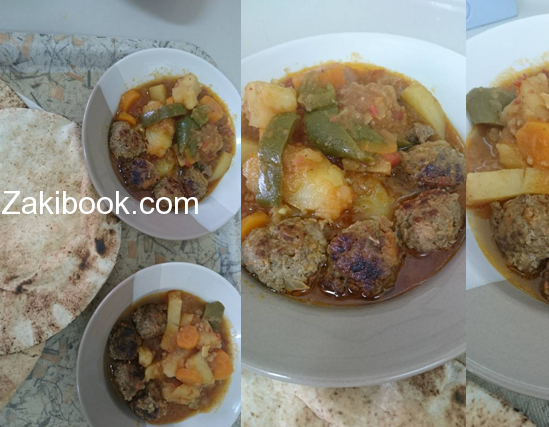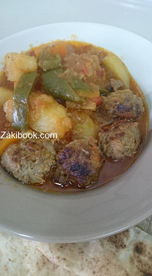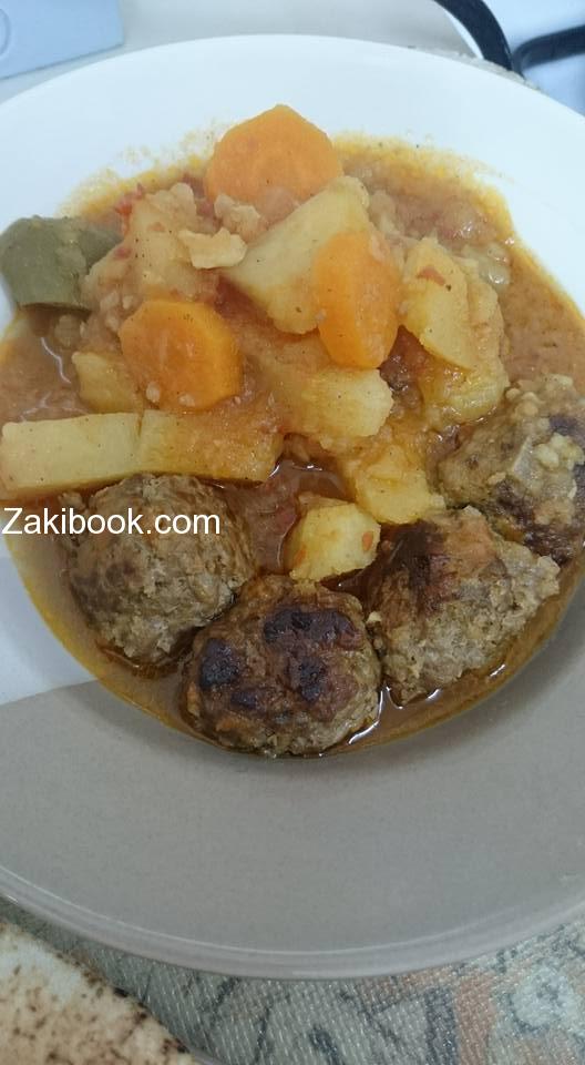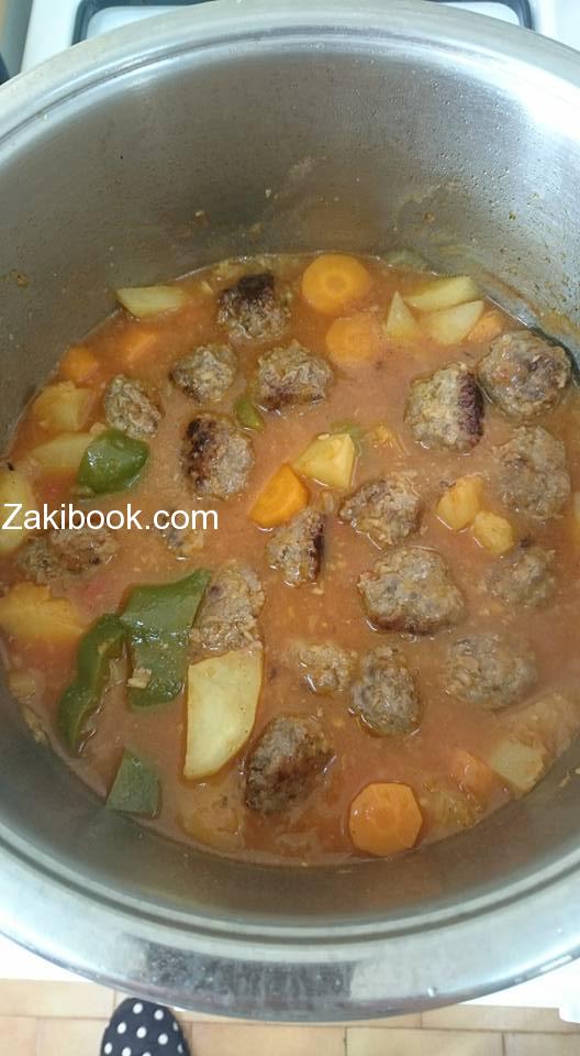 الآن نسقط كرات الكفته مع الصوص والخضار ونتركهم يغلون كمان حتى تستوي الخضار مع مراعاة ماتنشف الماء ..اذا احتجنا ممكن نضيف ماء شوي..