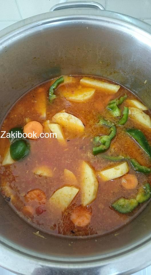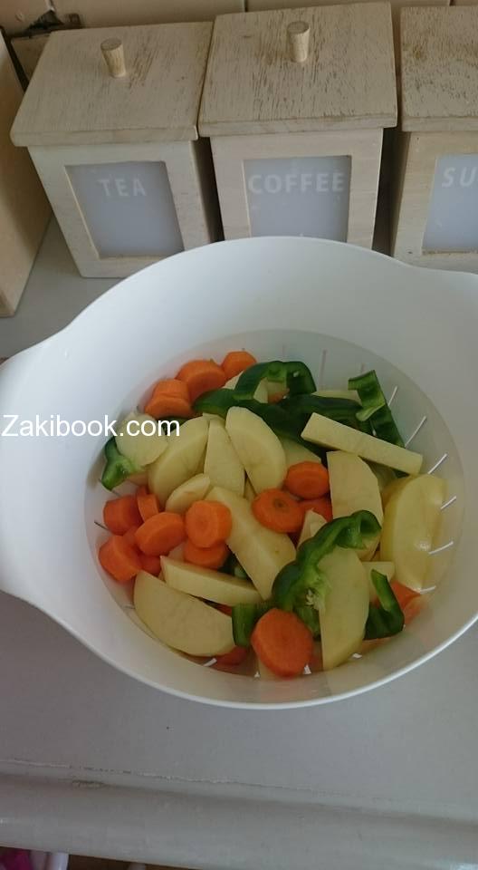 نقطع خضار انا واستخدمت بطاطس وجزر وفلفل بارد رومي..وممكن بازلاء وكوسة..