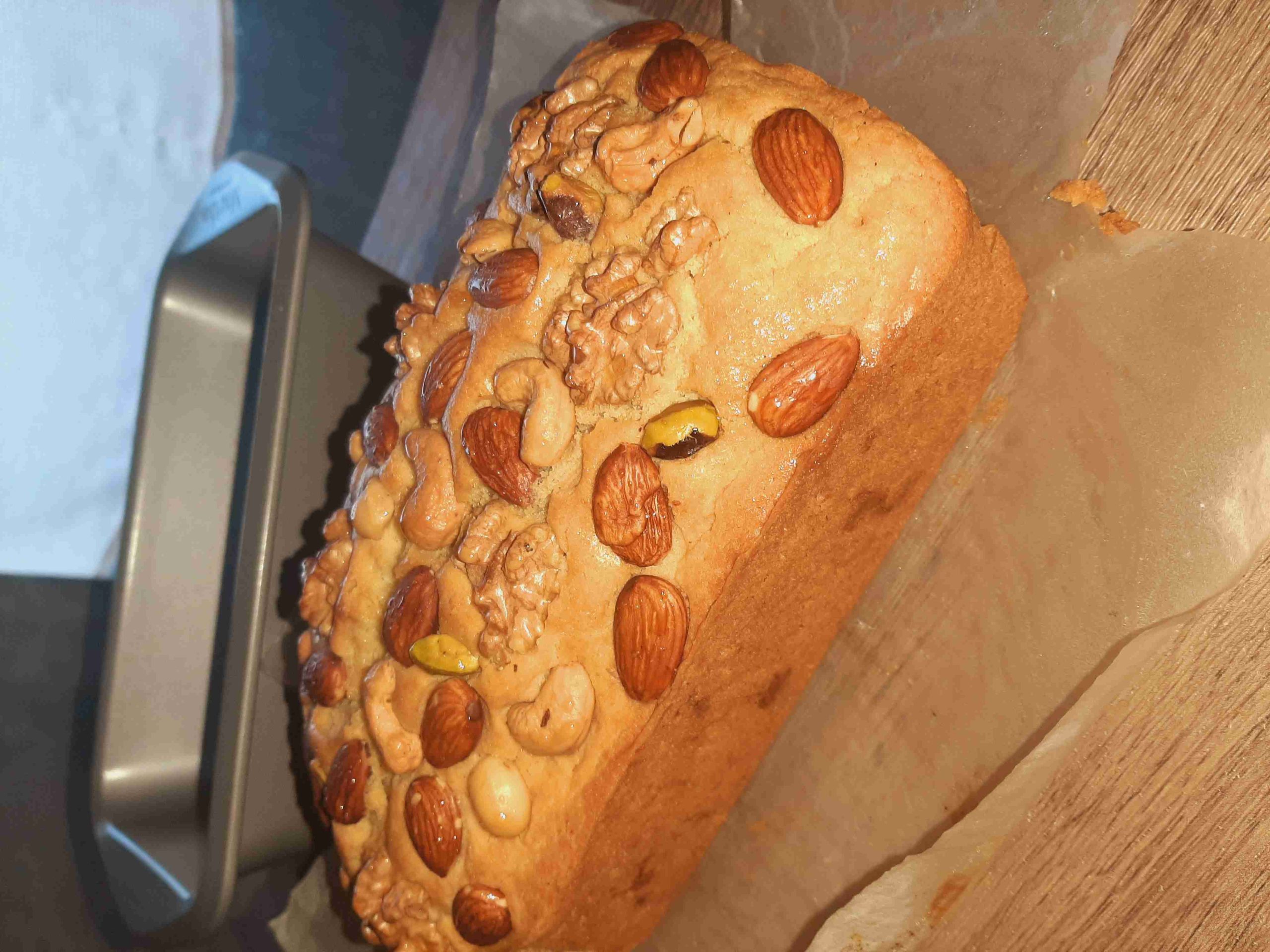 ونضعها في القالب مدهون بزبده ودقيق او ورق زبده ونضع فوقها المكسرات وندخلها الفرن مسخن مسبقا حرارة 180 لمدة تقريبا ساعه الا ربع وعندما تخرج من الفرن ندهنها من فوق بالعسل او المربى وصحتين وهنا لكل اللي حيجربها
