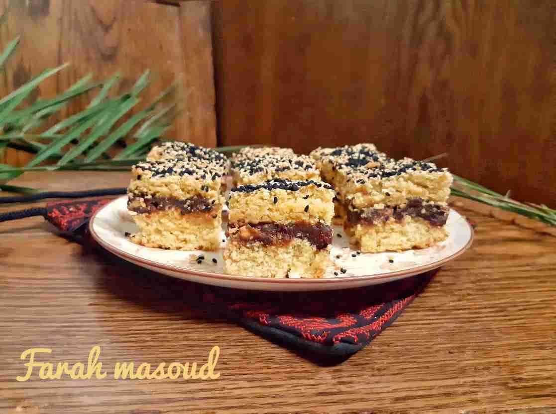 بجاط مدهون بالطحينية يصب نصف الخليط ثم يوزع تمر منزوع النواة يعجن مع زيت و قرفة ويانسون وهيل يوزع باقي الخليط يرش بالسمسم و القزحة تخبز بفرن حامي من قبل درجة 180 من الوسط بدها تقريباً 25 دقيقة حسب حرارة الفرن