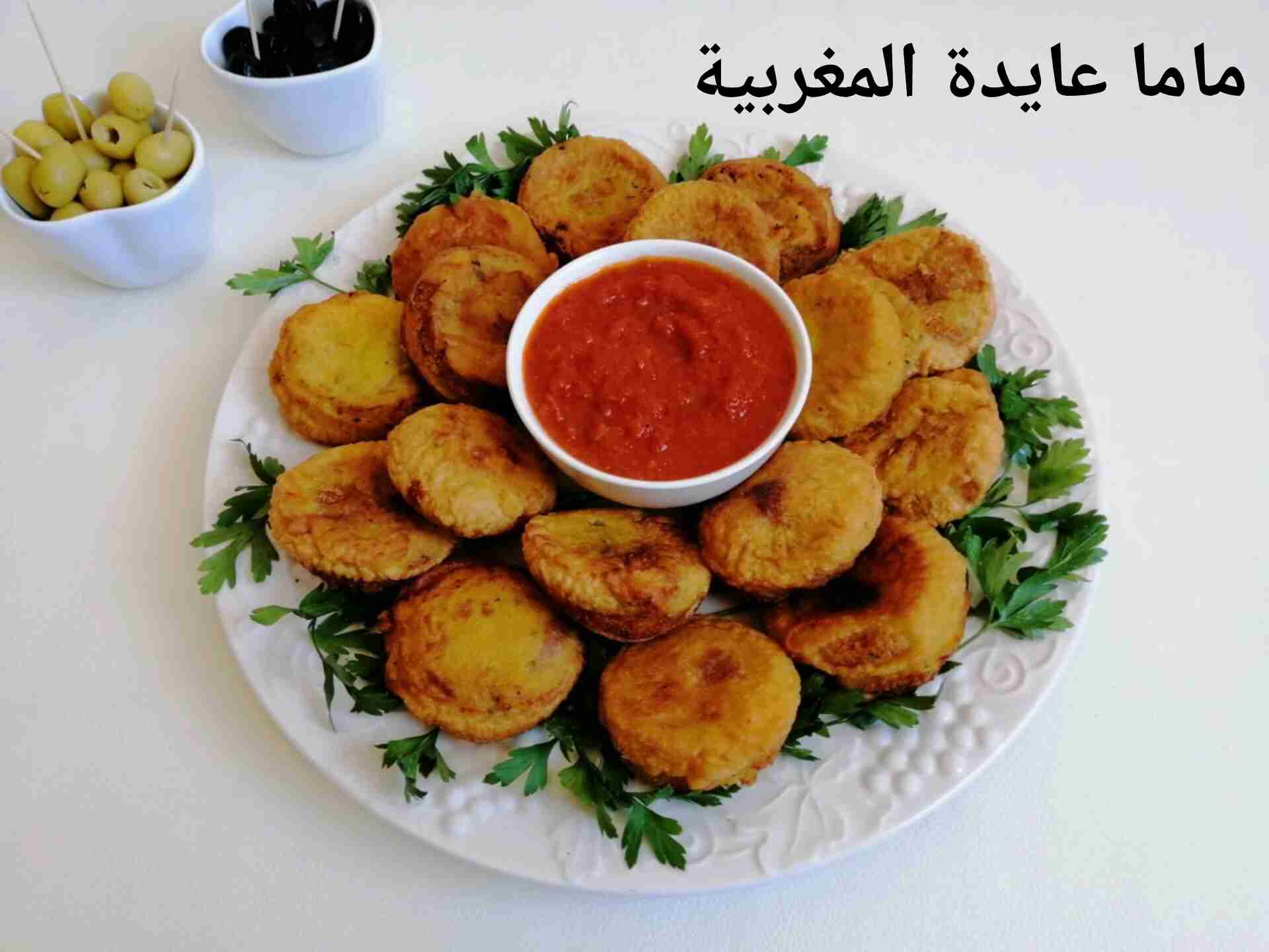 نخلط مكونات العجين نضيف البيضة مع الخل و نضيف بالتدريج الماء حتى نحصل على خليط بكثافة الكيك، نترك العجين يرتاح 10دقايق. نغطس أقراص البطاطس في خليط التغليف و نقليهم.