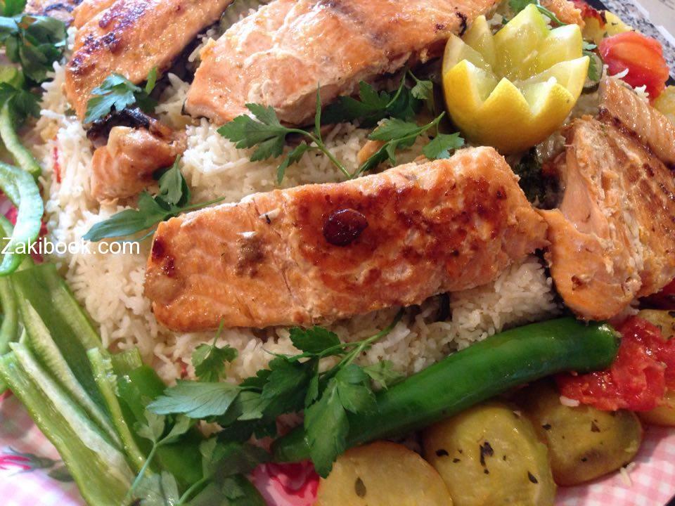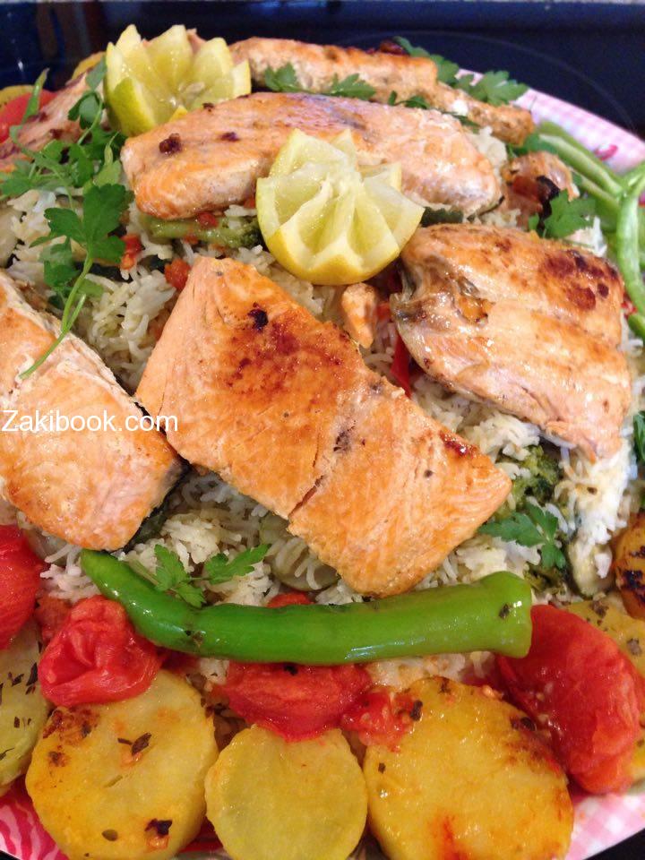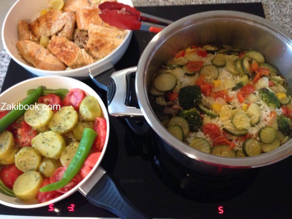 نضع في طنجرة قليل من السمنه والزيت ونقطع خضار (حسب الموجود )كوسا فليفله بروكولي جزر مع قليل من الملح ومن ثم نضيف قليل من الماء ونتركهم ليتم استوئهم ومنضيف بعدا الرز على الخضار ومنطبخ الرز مع الخضار منطبق الرز بالخضار بصحن التقديم ونضع البطاطا والبندور ومن فوقهم شرحات اللاكس والليمون وصحتين وهنا