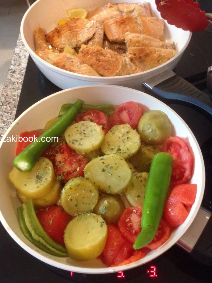 نضع بالمقلاة زيت زيتون وسن توم مقطع ونقلي شرحات السمك باضافة الفلفل الاسود الخاص للسمك نقطع بطاطا ونقليهيا مع بطاطا مقشره وفليفله واضافة الملح والتوابل حسب الرغبه،