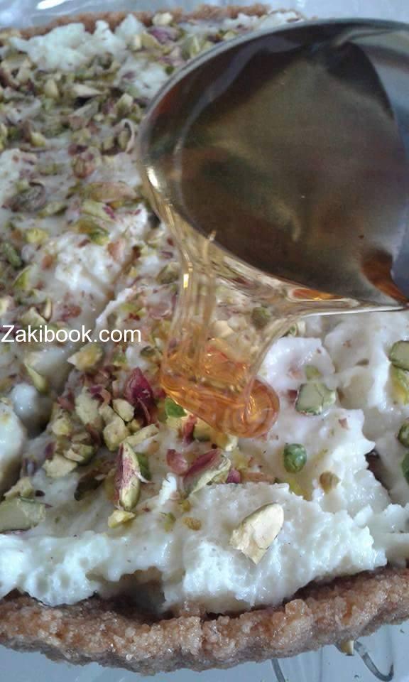 ثم نبدأ بإضافة مزيج القطروالسمنة الساخنة فوق الكنافة ونعجن بيدينا بحذر حتى نحصل على عجينة نقوم بفردها في صينية أو أي قالب ونضع القشطة بعد أن تبرد الكنافة ثم نزين بالفستق الحلبي ويقدم إلى جانبها قطر سميك أوعسل وصحتين وعافية <by> Noor Yosif