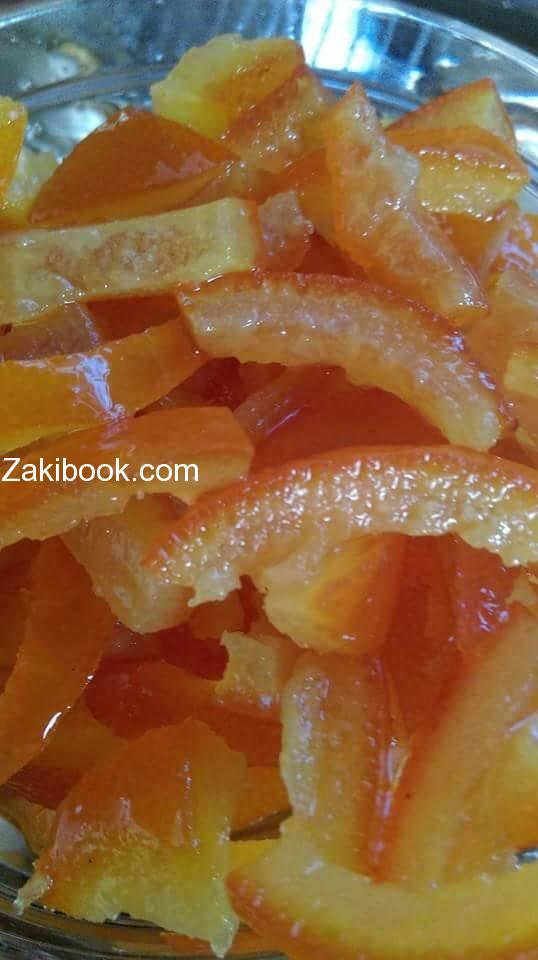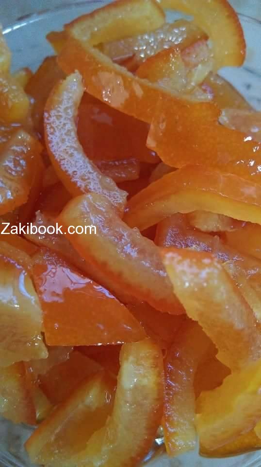 نقوم بغسل البرتقال وتقشيره بطريقة متساوية مع اللب الأبيض ونقطعه شرائح طولية ثم ينقع في الماء ونقوم بتبديل الماء كل ساعة تقريبا لمدة يومين