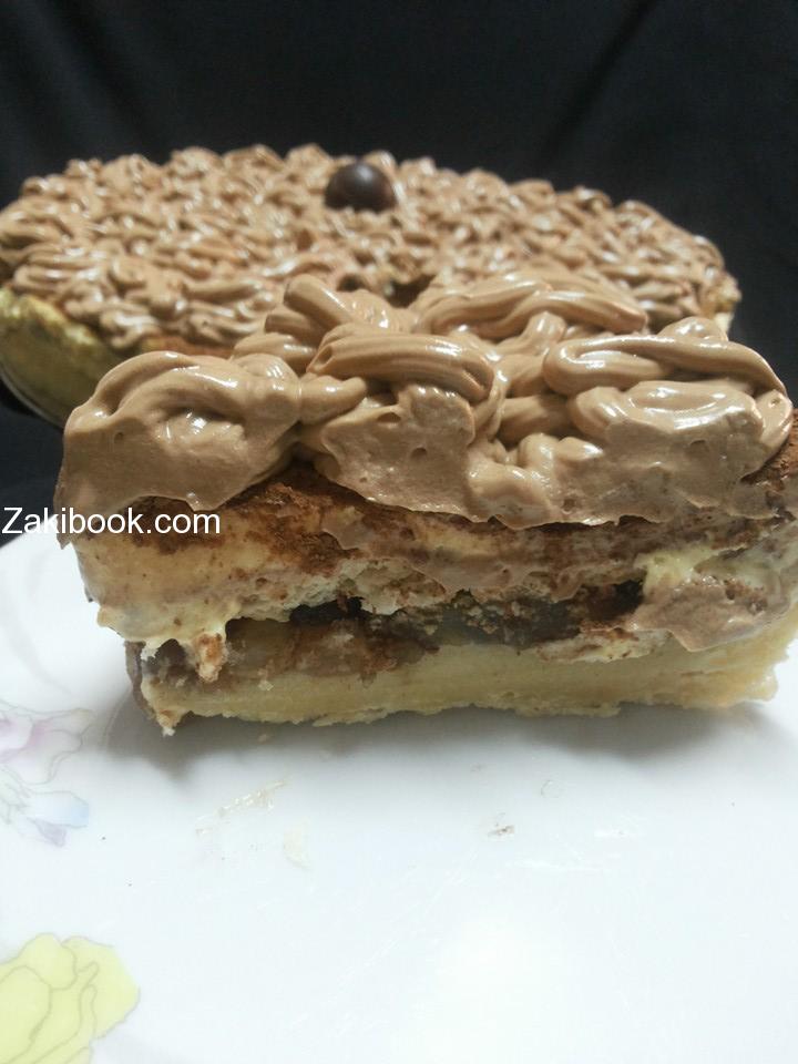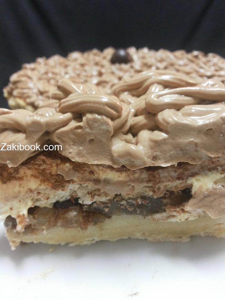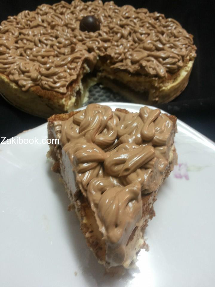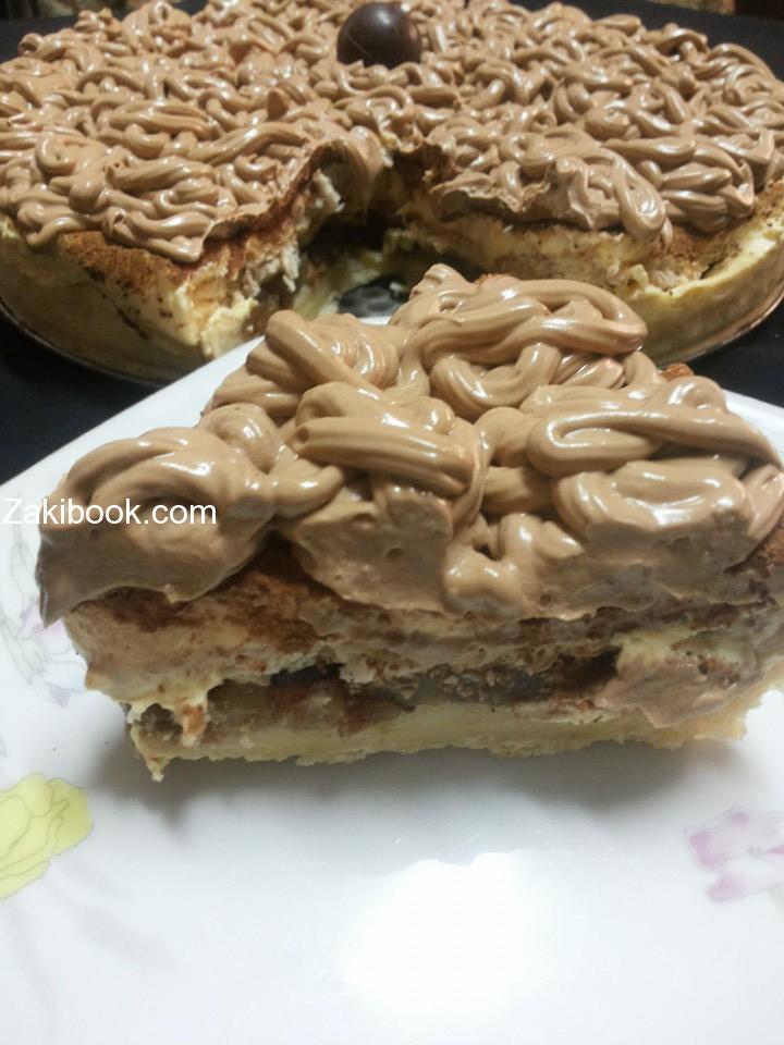 في الخلاط نضع مواد الطبقة الثانية وتصب فوق البسكويت وتوضع في التلاجة حتى تجمد
