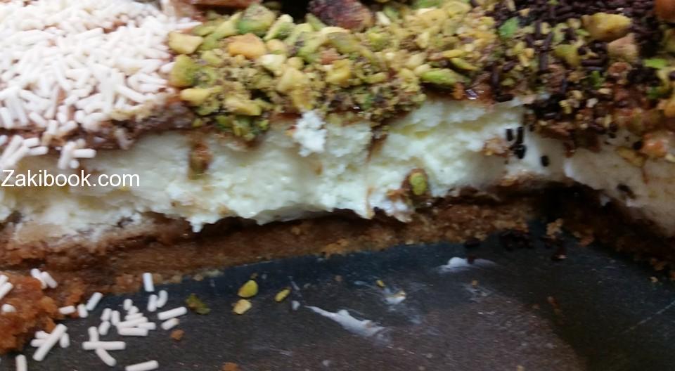 3 بيض وثلاث ارباع كوب سكر و600 غ جبنة فيلادلفيا وكوب كريما خفق وفانيليا و3 ملاعق نشا تخفق وتوضع فوق البسكوت وحمام مائي لمدة ساعة حرارة 180 س ثم نفتح باب الفرن ونكمل 30 دقيقة وتترك لتبرد بالفرن …
