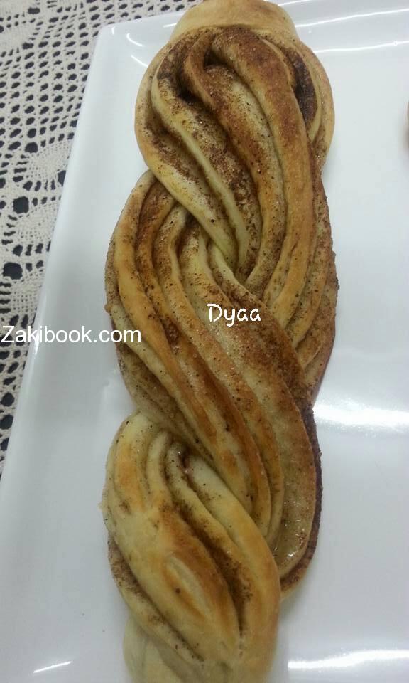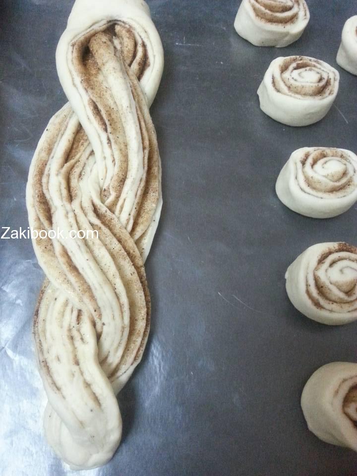 المستطيل المحشي بتبرميه رولو وبالسكين الحاد بتقطعي بالطول بالوسط بيصير عندك جزئين متل الجدولة (الضفيرة).بتبرمي جزء على التاني وبتوصليه مع بعضه من تحت