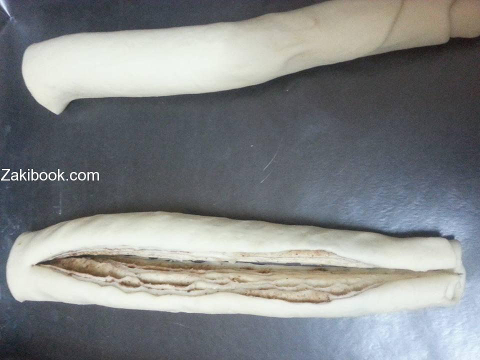 لفي العجينة رولو وضعي الرولو في صينية الفرن المغلفة بورق زبدة وبواسطة السكين اقطعي بالوسط طوليا (موضح بالصورة) ولفي الجزئين حول بعضهن.غطيها نصف ساعة قبل ادخالها الفرن.