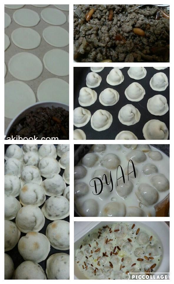 طحين وخميرة ورشة ملح ومي وانا بحط ملعقتين حليب وملعقتين زيت .وبفردها وبقطعها وبنحشيها بتحويسة بصل ولحمة وصنوبر وبهارات..وبنحشيها وعالفرن لتنشف مش لتتحمر .انتظري تبرد.