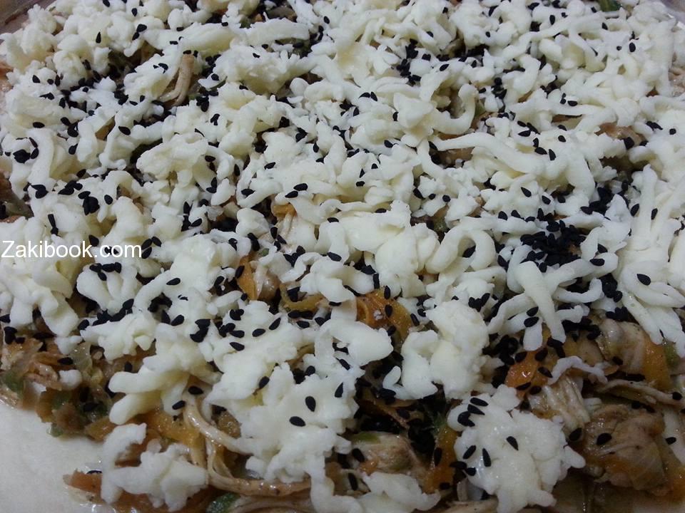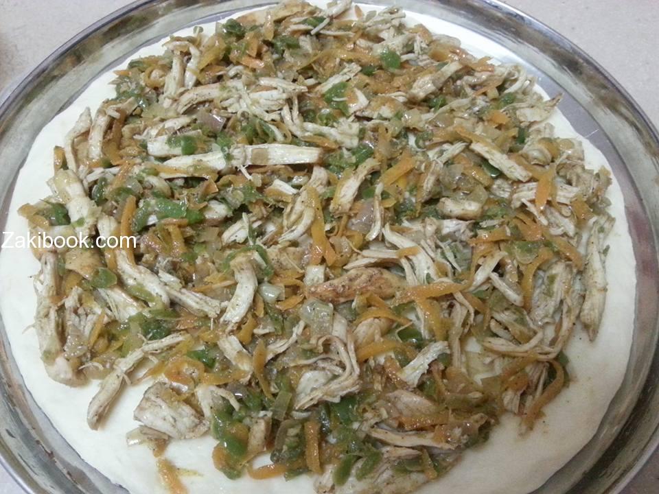 نمد اول طبقة من العجين بسماكة 1 سم في صينية الخبز .ثم نضع الحشوة( دجاج مسلوق ومفتت
