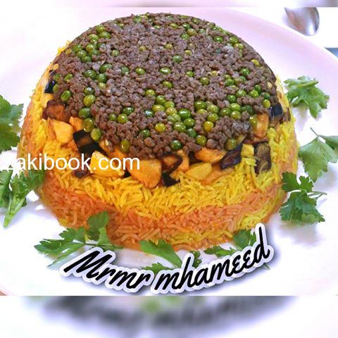 بعدها ضفت البطاطه والباذجان وضفت الرز الاحمر والاصفر بلتناوب وضغطت علرز حتى يتساوى وبعدها حطيت الكاسه على بخار علنار وغطيتها 10 دقايق بعدها صارت جاهزه للتقديم…. عاافيات… مرمر