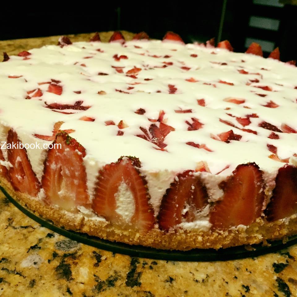 ونخفق قليلاً ومباشره بديرب فوق الكيك وهون بقطع فراولة قطع صغيره وبرميها على سطح الموس وعلى الثلاجه اقل شي اربع ساعات
