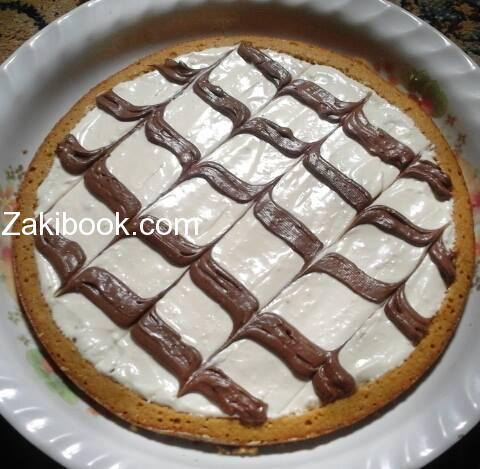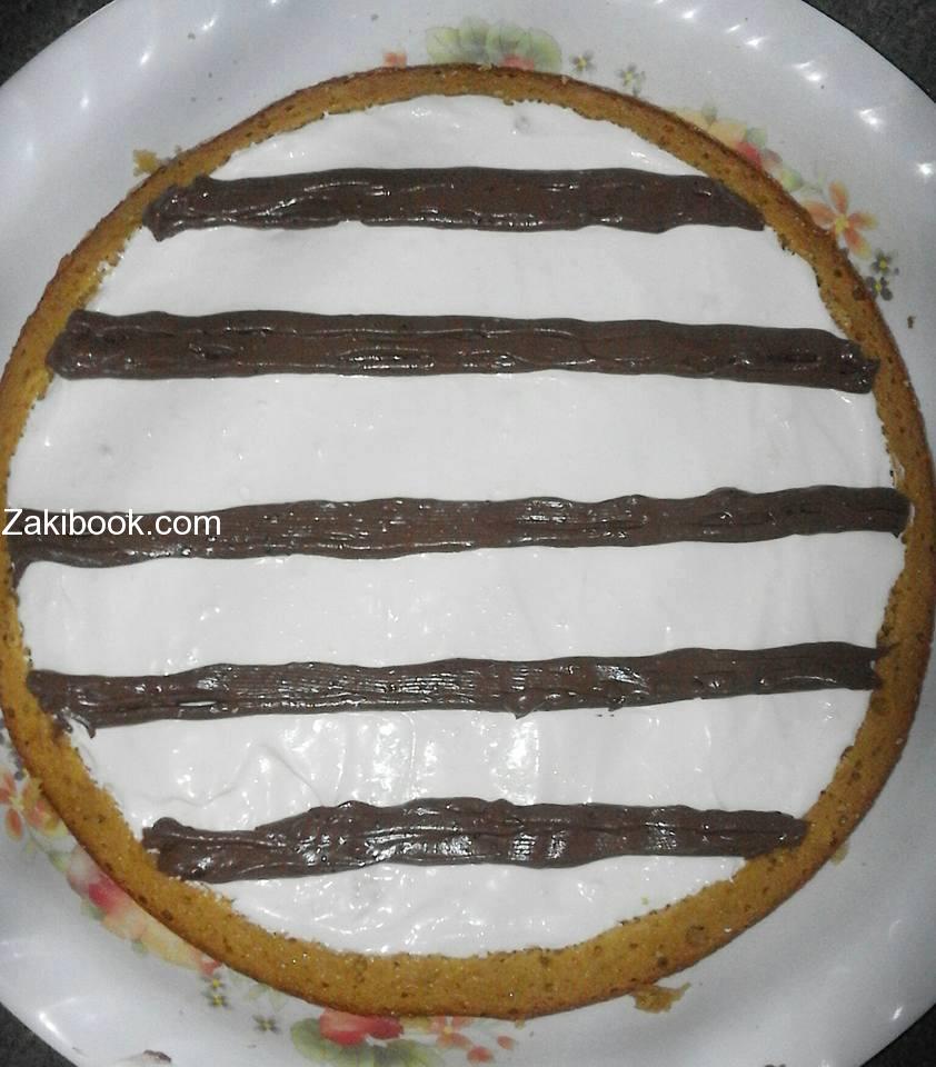 كنت مصوره كيف بس للأسف الظاهر مسحت الصورة بالغلط .. المهم بحط الحشوة البيضه و بوزعها منيح و بعدين بجيب الكاكاو اللي رفعته حطيته بكيس الكريمه و عملت الخطوط و بطرف السكينه اعملي خط رايح و خط جاي يعني عكس بعض و بالتلاجه .. أي سؤال أنا جاهزة .. بالعافيه