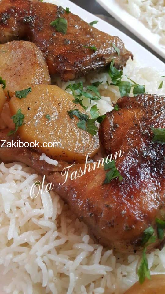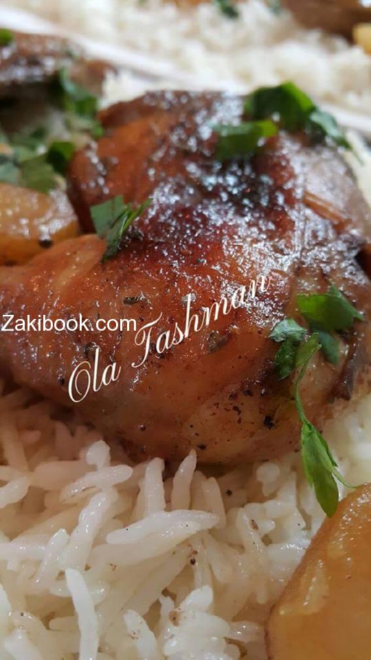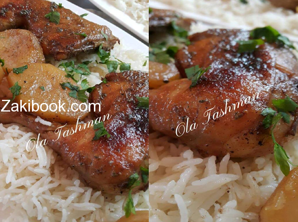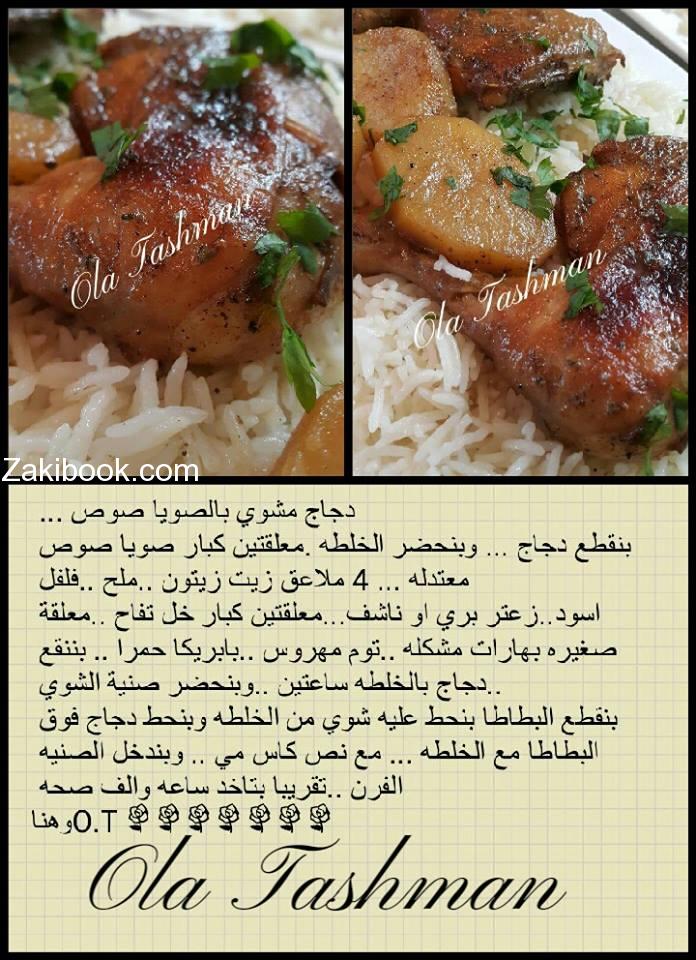 بننقع دجاج بالخلطه ساعتين ..وبنحضر صنية الشوي .. بنقطع البطاطا بنحط عليه شوي من الخلطه وبنحط دجاج فوق البطاطا مع الخلطه … مع نص كاس مي ..