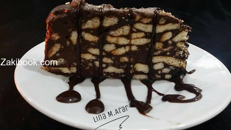 بكيتين بسكويت يكسر على الغاز نضع اصبع زبدة وعلبة حليب مكثف ومعلقتين كبار قشطة ومعلقتين سكر وربع كوب كاكاو ويحرك حتى تختلط كل المكونات نضع البسكوت على خليط الكاكاو