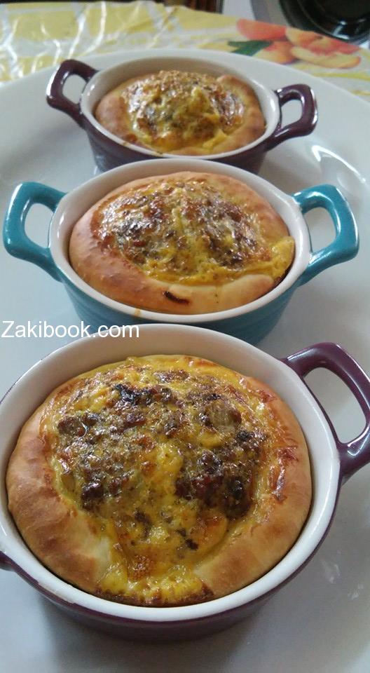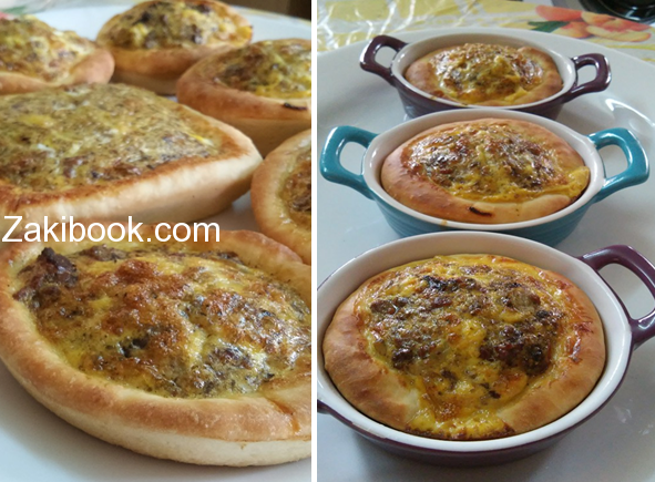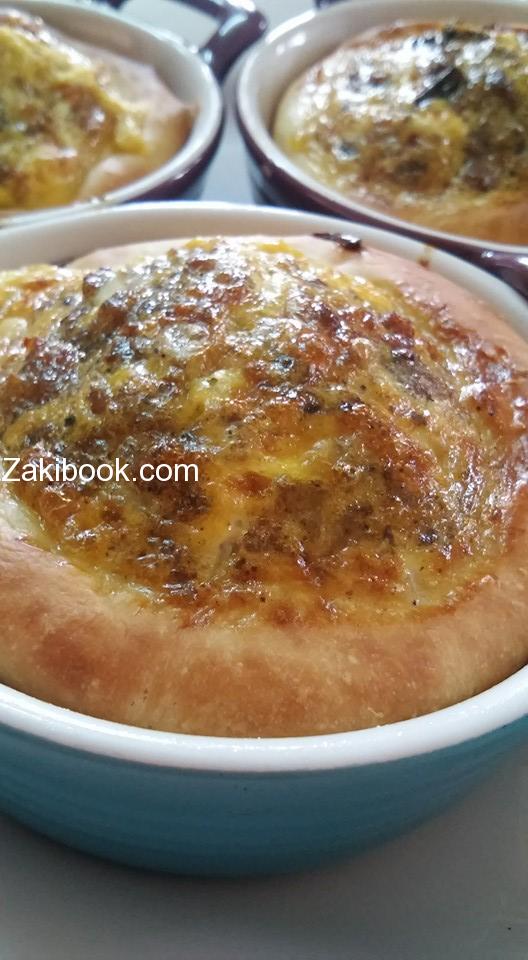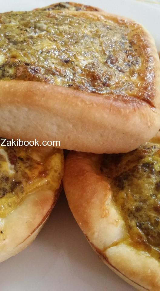 نفس الحشوه بنقسمها قسم بنحط عليه بيض حسب الكميه الي بتحبوها وبقدونس وفلفل اسود وملح على البيض وبنخلطه وبنكون محضرين العجينه مفروده بالصحن او صينيه وبنخبزها عادي على حراره وسط