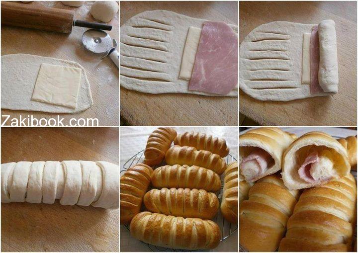 نأخذ كرة صغيرة من العجينة, ونفردها على شكل دائرة, ثم نأتي من الجوانب ونقطعها حتى نصل إلى المنتصف, ثم نضع الحشوة مثل الجبنة, ونلفها, وبعدها ذلك ندورها, لنحصل على الشكل الدائري الحلزوني.