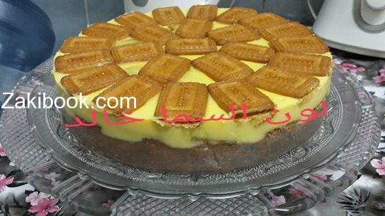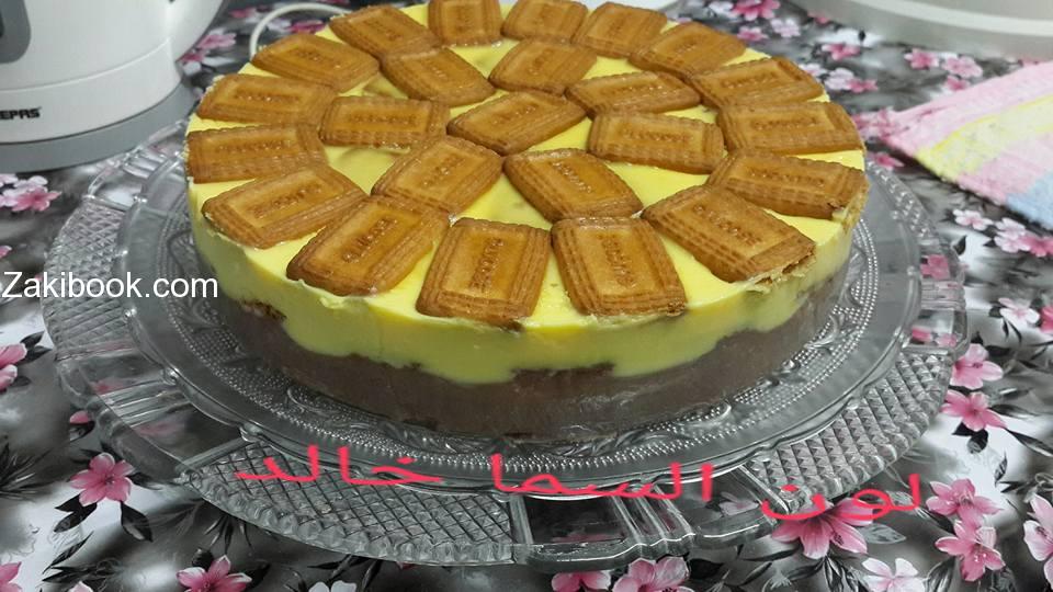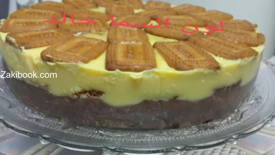وبنعمل مهلبيه عاديه ونضيفلها كاكاو ولما تتخن معانا نضيفها على طبقه البسكوت ونسبها تبرد وتتماسك دقايق ونحط طبقه تانيه من البسكوت المسقى بعصير المانجو