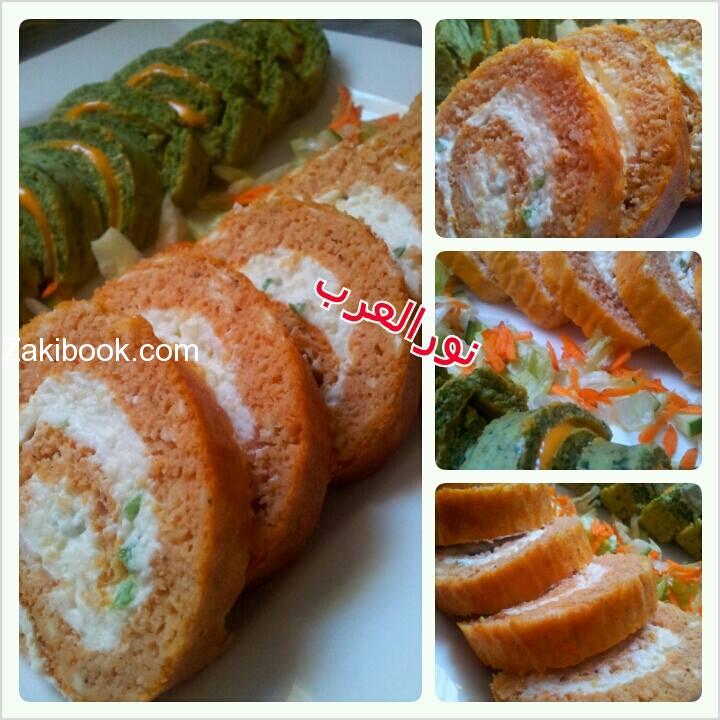 وممكن ترشي معدنوس او فلفل رومي مبشور على الجبنة ولفي السويسرول على شكل اسطواني وخليه ملفوف بورقة الزبدة وبعد يبرد قصيه وقدمية…
