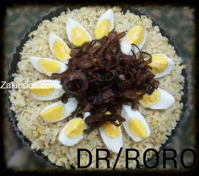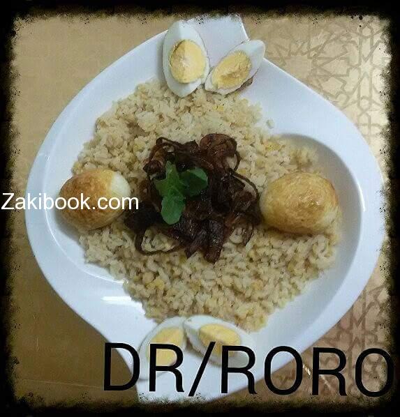 تسلقي بيض ولما يستوي تقشريه وتقلبيه فمعلقة سمن وتجيبي طبق تحطي الرز وفوقه البصل والبيض