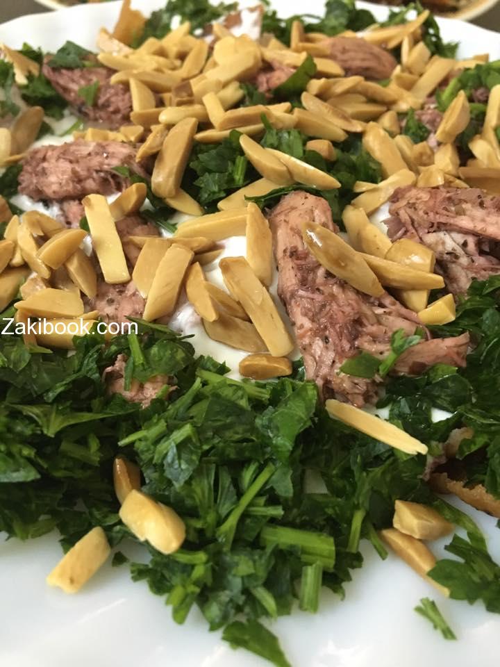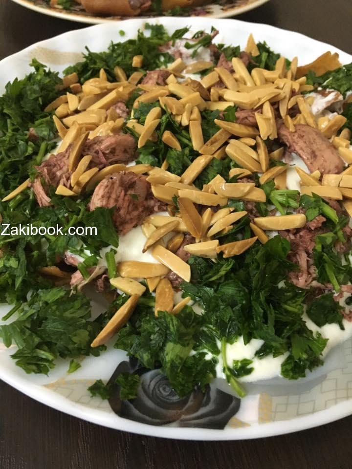 في طبق التقديم نضع الخبز المحمص ثم خليط البصل والدجاج ثم طرطور اللبن ويزين بالبقدونس واللوز