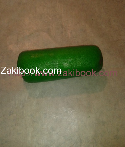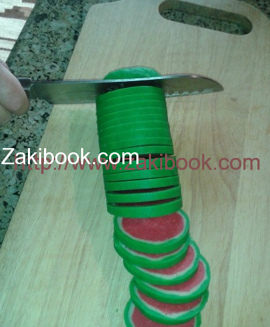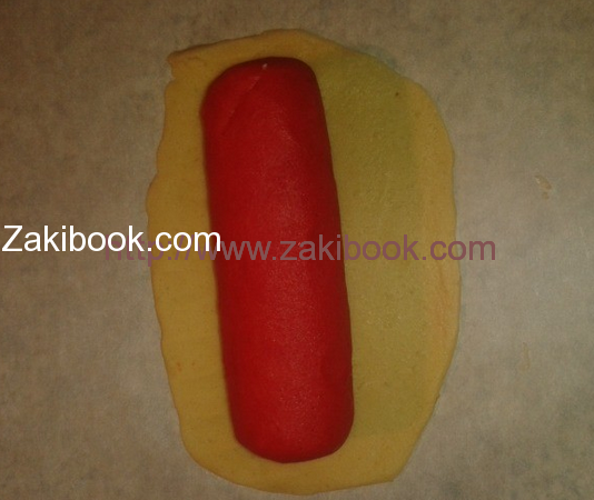 – الجزء الملون باللون الاحمر نعمله على شكل اسطوانة ونفرد الجزء الابيض ونلفه حول اللون الاحمر ثم نفرد الجزء الاخضر ونلفه حول اللون الابيض, نغلفه بالنايلون ونرجعه للتلاجة مدة ساعة.