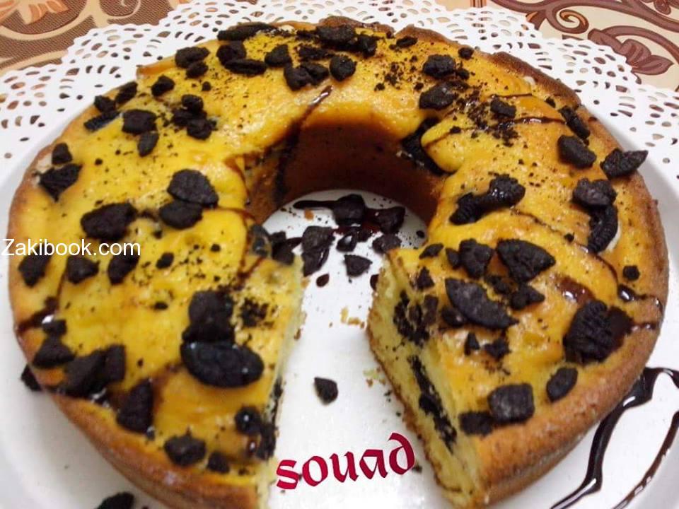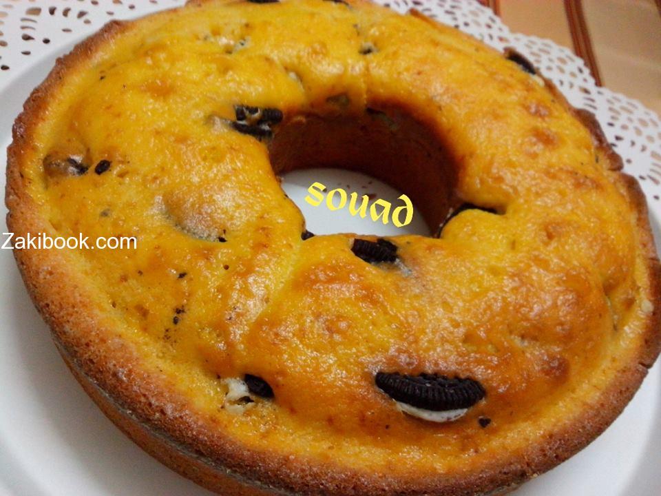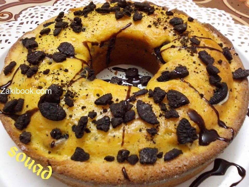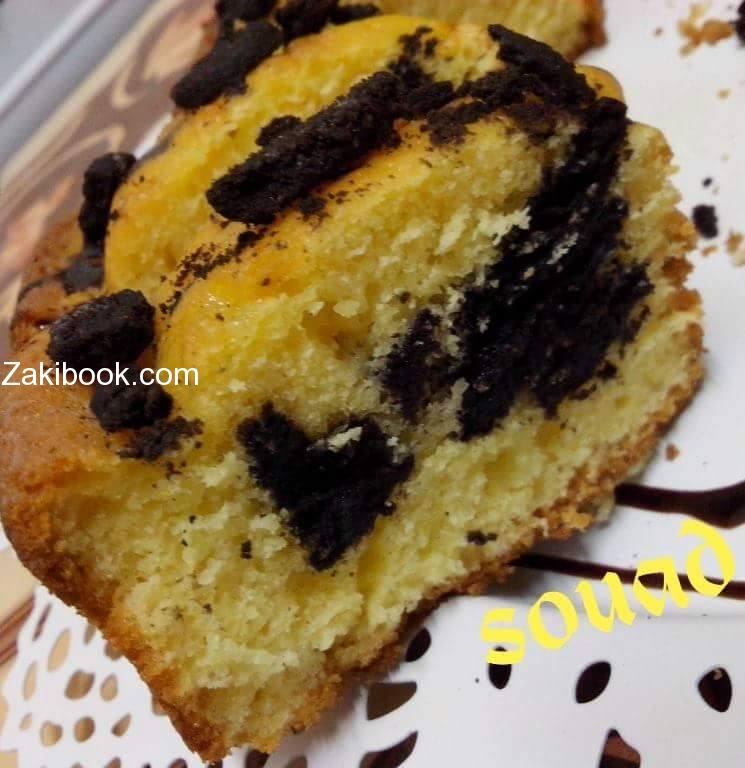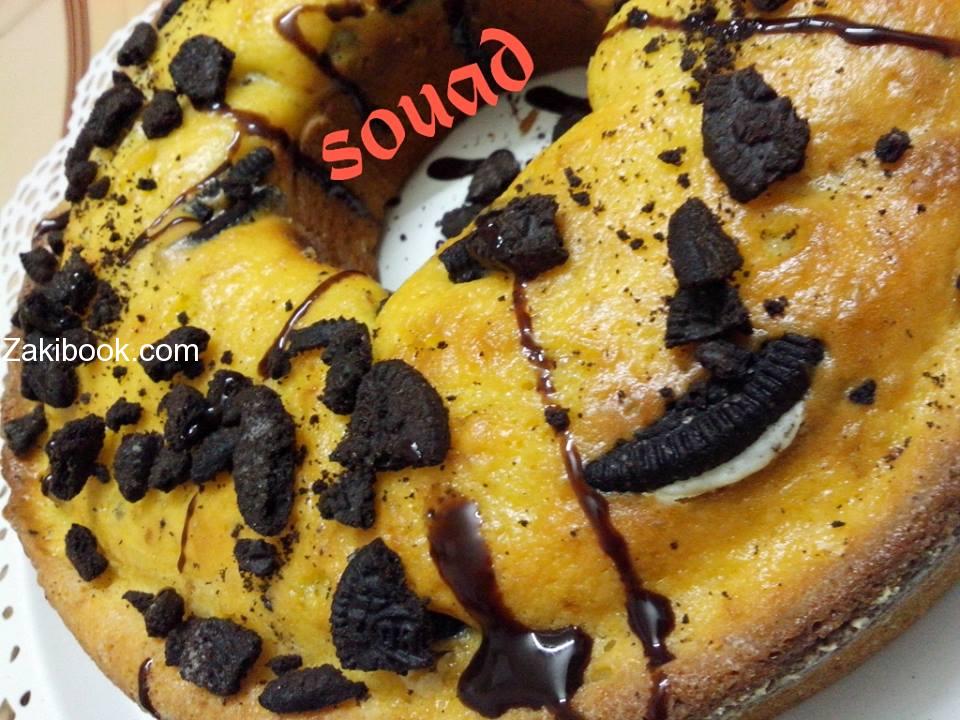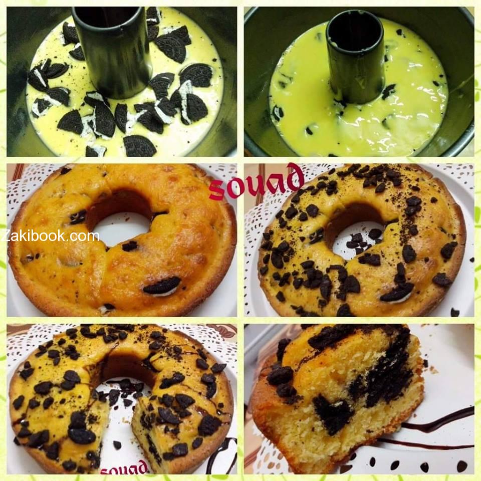 في قالب الكيك المدهون بقليل من الطحينة نضع قسم من المزيج ثم نوزع قطع الاوريو المكسرة ثم نضيف باقي المزيج.