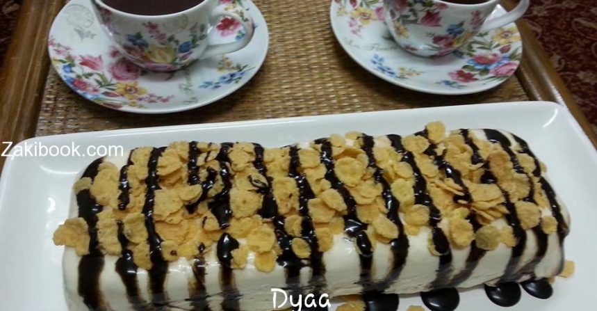 اتركيها بالفريزر يوم كامل عند التقديم ازيلي النايلون واقلبي القالب بصحن التقديم.زيني بالكورن فلاكس والشوكولا السائل .والف صحة..