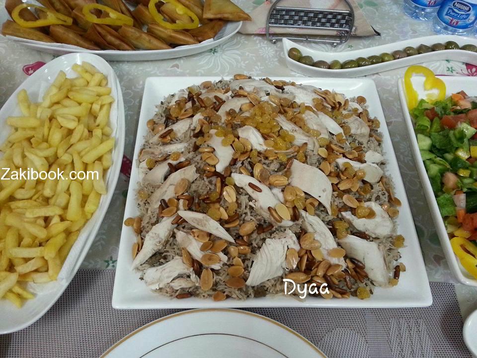 اطفئي الطنجرة وغطيها ببطانية مدة نصف ساعة ثم اقلبي الارز في طبق تلتقديم وزينيه بالدجاج المسلوق والمقطع لقطع متوسطة الحجم اضافة الى المكسرات..والف صحة