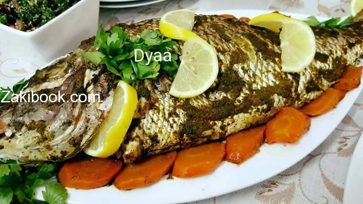 نضع شرائح الجزر حول السمكة.ونلف باقي السانيتا على السمكة دون الضغط عليها.. ندخلها الفرن على الرف الأوسط مدة نصف ساعة ثم نرفع السانيتا من فوقها وتركها ربع ساعة او اكثر حسب حجم السمكة ثم نشغل الفرن من فوق ونتركها ربع ساعة حتى يتغير لونها ..نتفقد النضج بغرز طرف سكين فيها …
