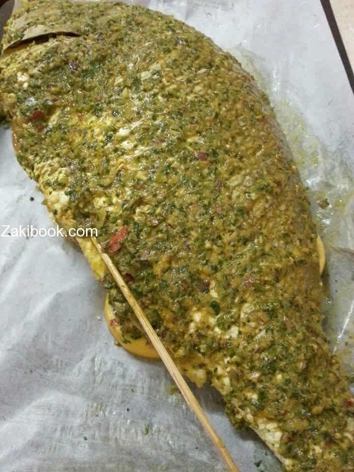 تحشى السمكة ونخيط حتى لا تقع الحشوة… ثم نوزع باقي الحشوة في الشقوق التي احدثناها بالسكين وعلى كامل جسم السمكة من الوجهين ..نغطي الصينية بالسانيتا ونضع تحت السمكة شرائح من الحامض حتى لا تلتصق السمكة بالسانيتا