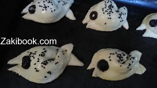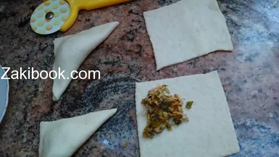 بترقي العجين وبتقطعيه بسكين البيتزا الى مربعات .بتحطي ملعقة من اي حشوة عند الزاوية وبتطوي المربع لتحصلي على مثلث .لزقي اطرافه بالضغط عليها.وقصي راس المثلث حوالي سم ليصير عندك شكل الفم واغرزي عود قرفة او مسمار للعين والطرفين لفي واحد عالتاني لتحصلي على شكل الذيل…
