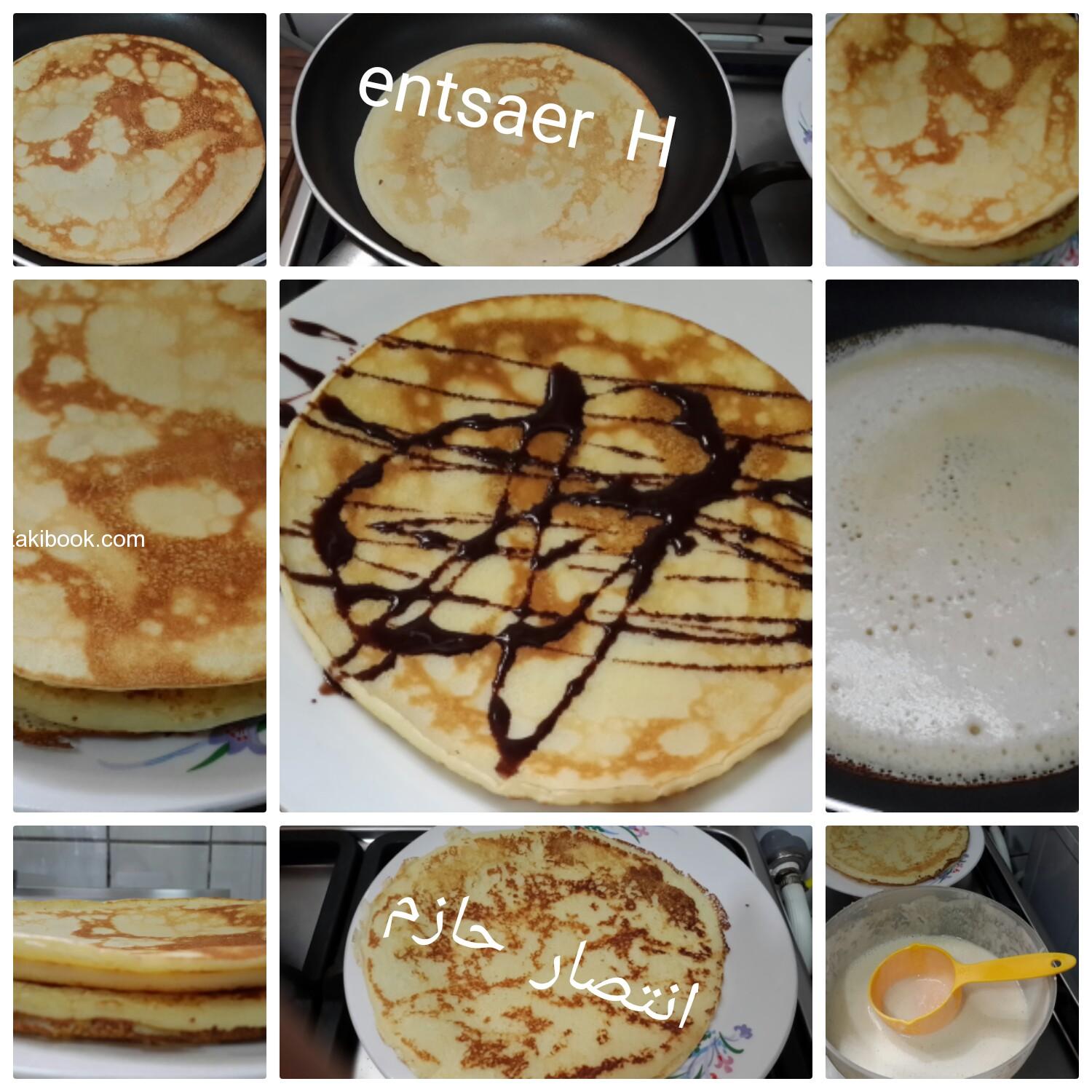 رابعا. نخرج الكريب من الثلاجة ونقليه بمقلاة مدهونة بالزيت ، بعدها يوضع بصحن التقديم ويزين بصوص الشوكلاه أو الكرميل حسب الرغبة.