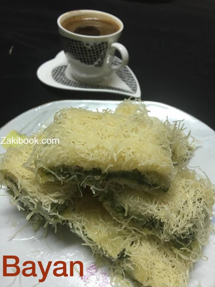 تبس عجينة الكنافة بالزبدة ويرص نصفها في صينية مدهونة بالزيت مع الرص جيدا ترش بالقليل من ماء الورد